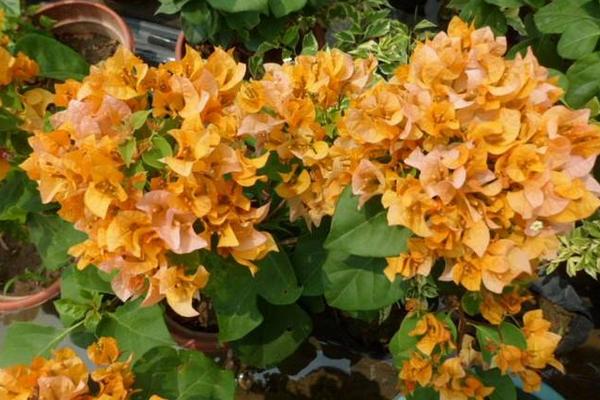 5、加州黄金三角梅。叶深绿,卵圆形,先端渐尖至急尖,萼管顶端裂片白黄色。花期在9月至第二年5月,黄色品种在每年秋季都能进入盛花期,但其耐寒性却不如普通三角梅,安全越冬需10℃以上才行。