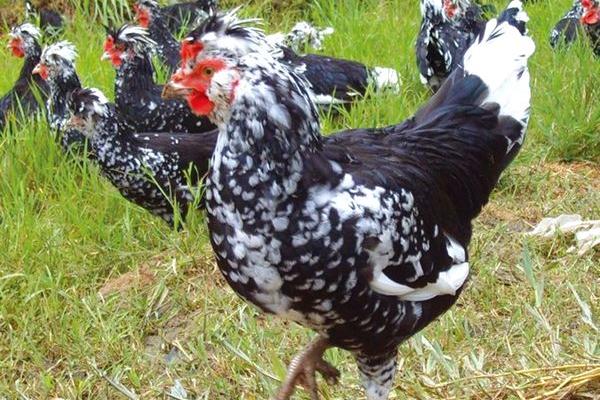 贵妃鸡因为披着一身黑白色的华丽羽毛,长得像贵妇,所以又叫做贵妇鸡,它的形状比较奇特,体型比较小巧,鸡冠的颜色是鲜红色,后面看起来像一个圆球状的黑白羽毛,这种鸡过去通常是被英国皇室来玩赏的,现在也被大量人工饲养了。