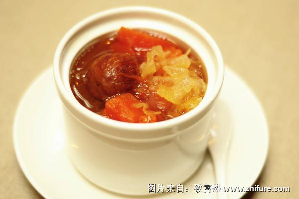 白色食物有很好的润肺作用。银耳,也叫白木耳、雪耳,有“菌中之冠”的美称。是名贵的营养滋补佳品。银耳的营养成分相当丰富,在银耳中含有蛋白质、脂肪和多种氨基酸、矿物质及肝糖。银耳有滋阴润肺,增强人体免疫力的作用。 木瓜素有“百益果王”之称。果皮光滑美观,果肉厚实细致、香气浓郁、汁水丰多、甜美可口、营养丰富,多吃可延年益寿。 这道木瓜银耳羹营养丰富,口味清香滑润,深受妇女同胞的爱戴。