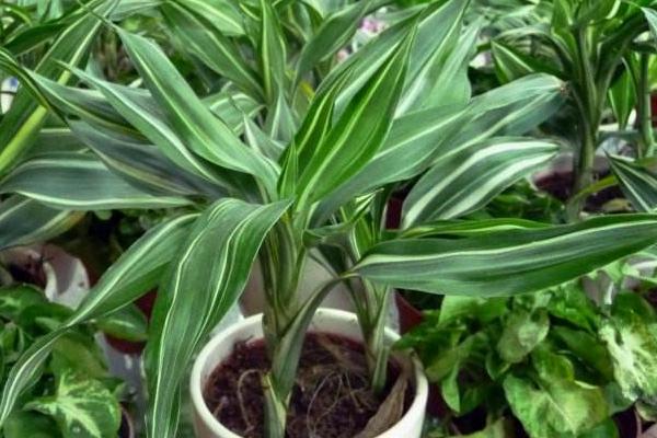 银心富贵竹和金心富贵竹有很大的相似之处,比较明显的不同是银心富贵竹的叶片中央有一道白色的纵条纹。