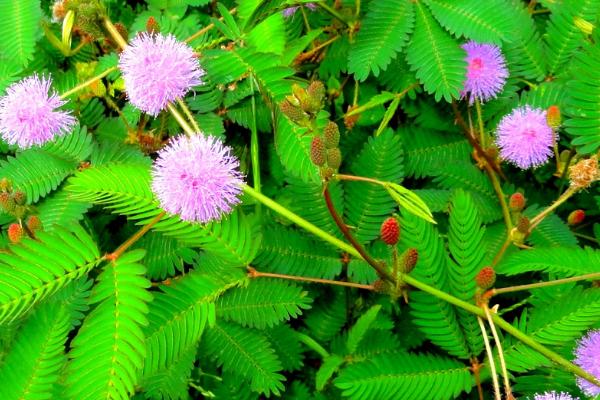 含羞草原产于南美热带地区,喜温暖湿润,对土壤要求不严,喜光,但又能耐半阴,故可作室内盆花赏玩。含羞草小叶细小,羽状排列,用手触小叶,小叶接受刺激后,即会合拢,如震动力大,可使刺激传至全叶,则总叶柄也会下垂,甚至也可传递到相邻叶片使其叶柄下垂,仿佛姑娘怕羞而低垂粉面。但娇羞可爱的含羞草其实是有毒的,我们千万不可小觑哦!