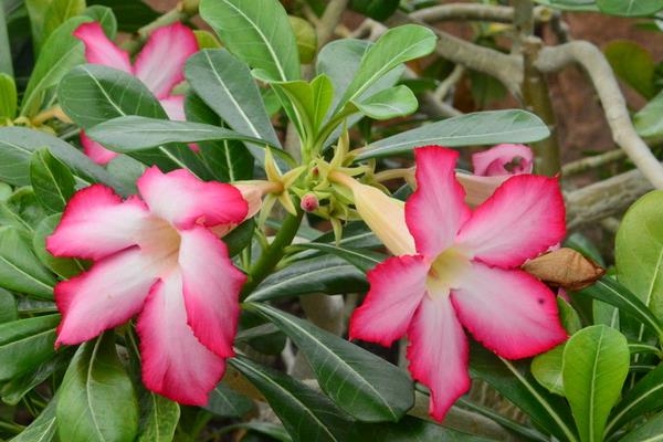 如果想要在沙漠玫瑰的植株上再嫁接其他优良品种,可以在短截之后的主枝上进行,嫁接成活后的枝条依据上述方法进行整型。