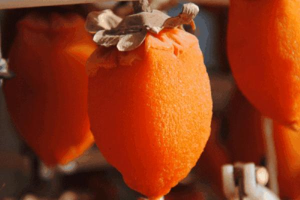 根据柿子晾干的程度判断是否还要继续晾晒。一般来说,在秋天晴好的天气下,晒七八天即可。这个时候可以看到有的柿子已经析出一些糖分,有的已经慢慢上了一点儿糖霜。途中要捏一捏柿子,一是可以去籽,二是可以感受柿子的软硬程度。柿子捏一捏就由原先的金黄变成褐色的了——吊饼已见雏形。