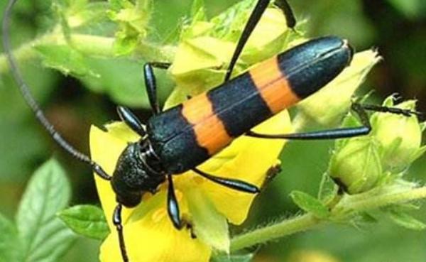 5、花天牛:花天牛为天牛科花天牛亚科昆虫,体型近方形,头、胸短小,鞘翅较平宽,雌虫显著较雄虫宽大,头宽小于前胸,触角不达鞘翅末端,第四节短于第三节或第五节。