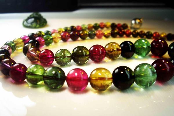 3、我们购买碧玺手串或珠链时要注意在其中混入水晶或玛瑙等价值较低的珠子,带有色泽的这些低档珠子往往透明度较碧玺差,光亮度也比不上碧玺。