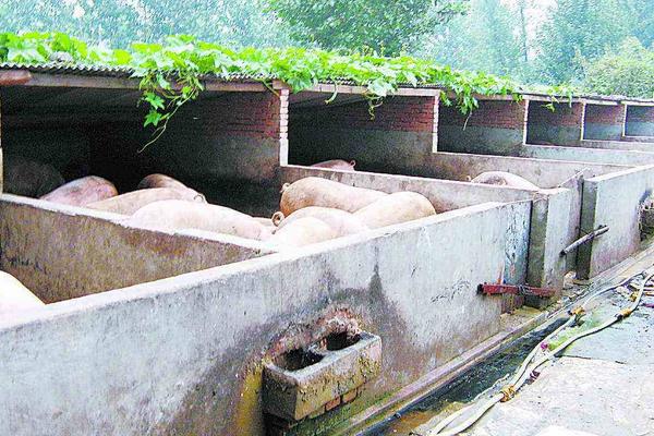 敞开的大门,铁链链着的两条大狗分别被拴在简易铁门和猪舍前。一股熏人的猪粪味道在雨后潮湿的空气中弥散着,记者上前一看,白花花的5头猪正在猪舍第一栏里休息。