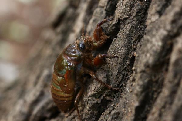 2、等待2-4小时后,爬猴就会开始蜕皮,变成蝉(知了),根据爬猴的这一特性,一般在每年的夏至过后,期间天气无雨干旱,可及时给养殖场地浇湿透,引诱爬猴冒土,在爬猴冒土前,或者在爬猴成熟前,可在离地30cm的树干上,捆绑一圈光滑的塑料薄膜,使爬猴不能继续往树干爬行,以方便及时进行采收。