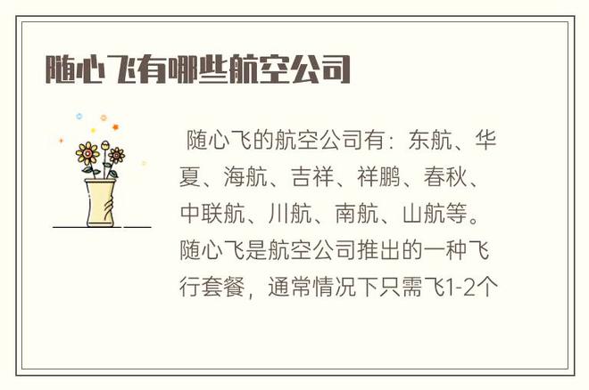 随心飞的国际航空公司有:东方航空、华夏、海南航空、吉祥如意、祥鹏、秋春、中联航、四川航空、南方航空、山航等。随心飞是国际航空公司推出一种航行套餐内容,一般来说仅需飞1-2个来回就可值回票价。