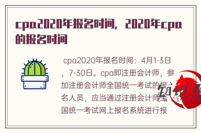 cpa2020年报名时间:4月1-3日,7-30日。cpa即注册会计师,参加全国注册会计师统一考试的申请人,应通过全国注册会计师统一考试在线注册系统或中国注册会计师协会(以下简称中国注册会计师协会)官方微信公众号注册。