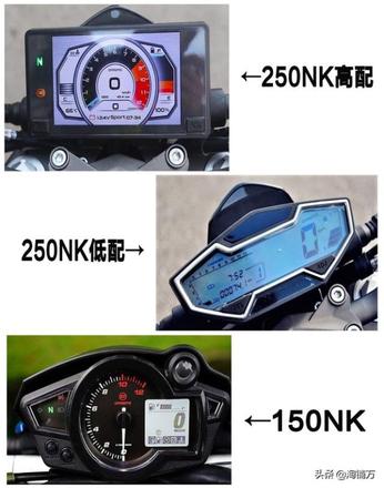 150NK和250NK排量差距摆在那,性能自然相去甚远。150NK百公里加速17.24秒,极速成绩110km/h左右,250NK百公里加速7.2秒,极速150km/h左右。同样是单缸发动机,车重相差9Kg,250NK强的不是一点半点。配置方面:150NK是传统的机械指针+小面积LED仪表,好看但是科技感不强,250NK低配单色LED,高配全彩TFT科技感十足。另外国四春风150NK没有了ABS版本着实可惜,250NK则是高配才有ABS,低配同样没有ABS,这种安全性的配置一定要注重。