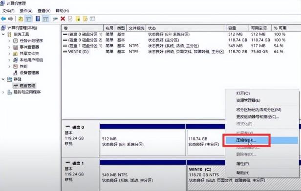 我们只对主分区进行操作就可以了,在计算机管理窗口中间的区域,找到主分区选项,鼠标左键单击主分区,在单击鼠标右键选择“压缩卷(H)