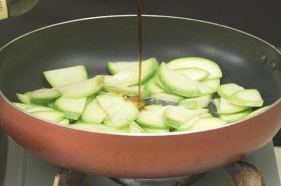 3、往里面加入少量盐和生抽后,不断翻炒至西葫芦片变软。