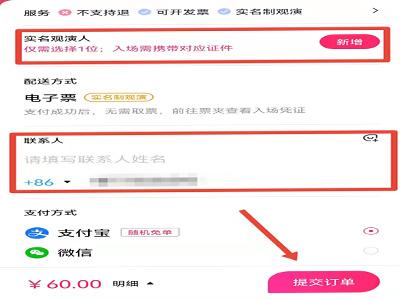 5、新增实名观演人,填写联系人姓名,选择支付方式,点击“提交订单”即可。